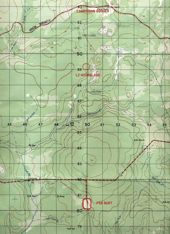 2. According to radio logs from the 187th AHC, The Hourglass was due north of FSB Burt at XT500890. It was about 4 Km south of the Cambodian border. Itโs probably the clearing just north of the words โSuoi Tankenโ